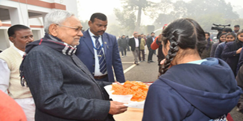 Nitish Kumar :- बिहार में सियासी बदलाव को लेकर प्रदेश की राजधानी पटना सहित राष्ट्रीय राजधानी दिल्ली तक हलचल है। वहीं शुक्रवार को बिहार के मुख्यमंत्री नीतीश कुमार मुख्यमंत्री आवास में जलेबी बांटते नजर आए। गणतंत्र दिवस के मौके पर नीतीश कुमार ने अपने मुख्यमंत्री आवास पर तिरंगा फहराया और लोगों को गणतंत्र दिवस की बधाई दी। इस मौके पर स्कूली छात्राएं भी पहुंची थी। मुख्यमंत्री इस दौरान उपस्थित सभी लोगों के बीच जलेबी बांटते नजर आए।