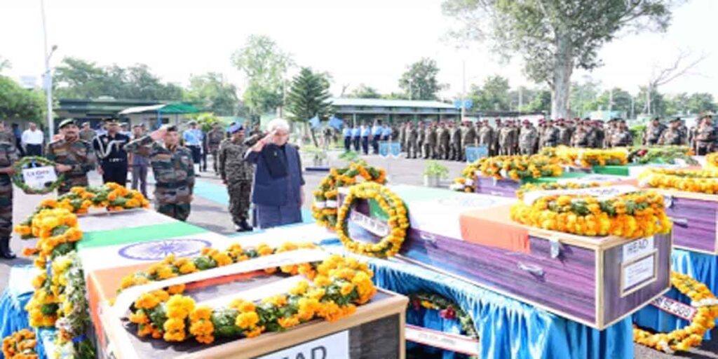 जम्मू। जम्मू-कश्मीर (Jammu Kashmir) के उपराज्यपाल मनोज सिन्हा (Manoj Sinha) ने जम्मू-कश्मीर के राजौरी जिले (Rajouri District) के कंडी वन क्षेत्र में आतंकवादियोंके खिलाफ अभियानों में सेना के शहीद जवानों को शनिवार को माल्यार्पण किया और श्रद्धांजलि (Homage) अर्पित की। उपराज्यपाल ने कहा, पूरा देश वीर शहीदों के परिवारों के साथ कंधे से कंधा मिलाकर खड़ा है। कृतज्ञ राष्ट्र हमेशा उनकी अद्वितीय वीरता का ऋणी रहेगा।