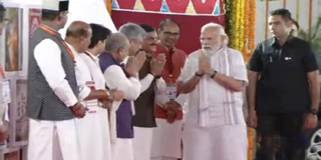 Narendra Modi :- प्रधानमंत्री नरेंद्र मोदी वायु सेना के विशेष विमान से भोपाल पहुंच गए हैं। हवाई अडडे पर उनकी मुख्यमंत्री शिवराज सिंह चौहान सहित तमाम नेताओं ने अगवानी की और उसके बाद वे सड़क मार्ग से रानी कमलापति स्टेशन पहुंचे। प्रधानमंत्री तय समय पर विमान से भोपाल पहुॅचे, जहां उनका जोरदार स्वागत किया गया। प्रधानमंत्री को स्टेट हैंगर से हेलीकॉप्टर से बरकतउल्ला विश्वविद्यालय और फिर वहां से रानी कमलापति स्टेशन जाना था, मगर बारिश के कारण कार्यक्रम में कुछ बदलाव हुआ और प्रधानमंत्री सड़क मार्ग से रानी कमलापति स्टेशन पहुंचे। यहां उन्होंने पांच वंदे भारत रेलगाड़ियां — भोपाल- इंदौर, भोपाल-जबलपुर, रांची-पटना, धारवाड़-बैंगलुरु और गोवा (मडगांव)-मुंबई को हरी झंडी दिखाई। इनमें से दो गाड़ियां रानी कमलापति स्टेशन से रवाना होगी।