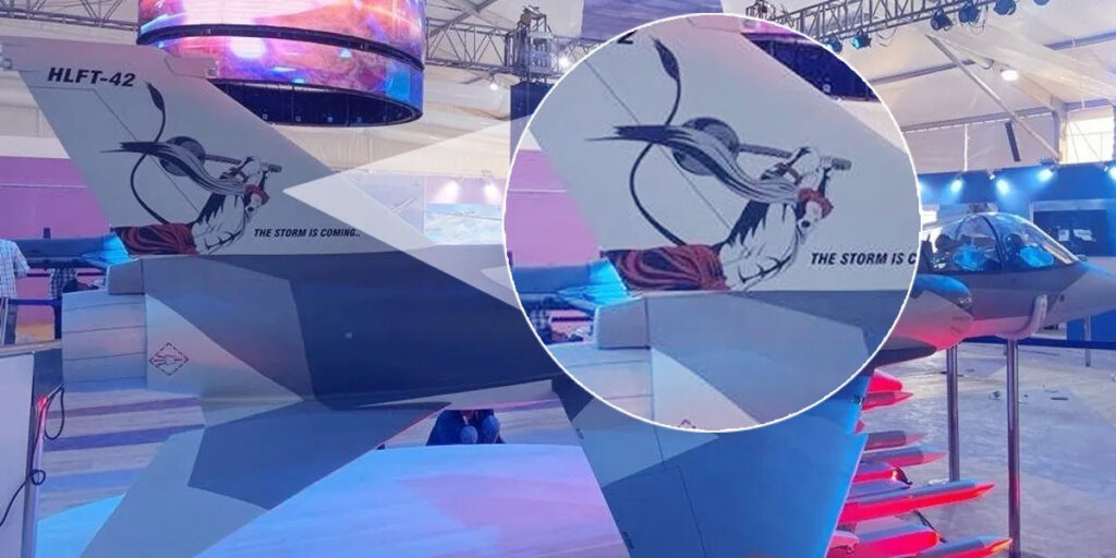 विमान पर लगे स्टिकर में आंजनेय (हनुमानजी को इस नाम से भी पुकारा जाता है), को युद्ध मुद्रा में अपनी गदा के साथ दिखाया गया है। स्टिकर के नीचे कैप्शन में ‘द स्टॉर्म इज कमिंग’ यानी ‘तूफान आ रहा है’ लिखा हुआ है। गौरतलब है कि एयरो शो के पहले दिन, एचएएल के सुपरसोनिक ट्रेनर विमान एचएलएफटी-42 की ‘टेल’ पर हनुमानजी की तस्वीर लगी थी, जिसे अगले दिन हटा दिया गया था लेकिन शो के आखिरी दिन शुक्रवार फिर से वही तस्वीर देखने को मिली।