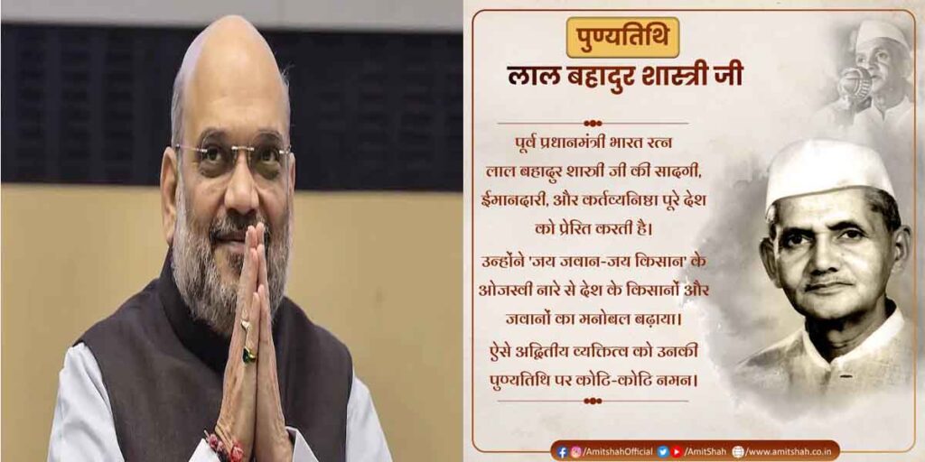 नई दिल्ली। केंद्रीय गृह मंत्री अमित शाह (Amit Shah) ने पूर्व प्रधानमंत्री (former Prime Minister) लाल बहादुर शास्त्री (Lal Bahadur Shastri) की 57वीं पुण्यतिथि पर बुधवार को उन्हें श्रद्धांजलि अर्पित की और कहा कि उनकी सादगी, ईमानदारी और कर्तव्यनिष्ठा पूरे देश को प्रेरित करती है। शाह ने एक ट्वीट में कहा, पूर्व प्रधानमंत्री भारत रत्न लाल बहादुर शास्त्री की सादगी, ईमानदारी और कर्तव्यनिष्ठा पूरे देश को प्रेरित करती है। उन्होंने ‘जय जवान-जय किसान’ के ओजस्वी नारे से देश के किसानों और जवानों का मनोबल बढ़ाया। ऐसे अद्वितीय व्यक्तित्व को उनकी पुण्यतिथि पर कोटि-कोटि नमन।