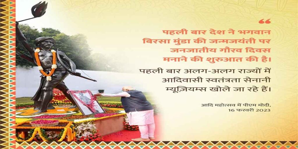 नई दिल्ली। प्रधानमंत्री नरेंद्र मोदी (Narendra Modi) ने गुरुवार को यहां मेजर ध्यानचंद राष्ट्रीय स्टेडियम में राष्ट्रीय आदिवासी महोत्सव (National Tribal Festival) आदि महोत्सव का उद्घाटन किया। इस मौके पर श्री मोदी ने आदिवासी स्वतंत्रता सेनानी बिरसा मुंडा (Birsa Munda) को श्रद्धांजलि अर्पित की।