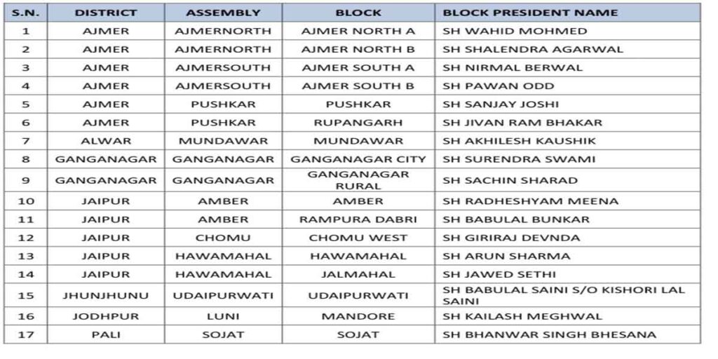 इसी तरह अजमेर जिले में अजमेर उत्तर-ए ब्लॉक में वाहिद मोहम्मद, अजमेर उत्तर-बी में शैलेंद्र अग्रवाल, अजमेर दक्षिण-ए में निर्मल बेरवाल, अजमेर दक्षिण-बी में पवन ओड, पुष्कर में संजय जोशी एवं रुपनगढ़ में जीवन राम भाकर को ब्लॉक अध्यक्ष नियुक्त किया गया है।