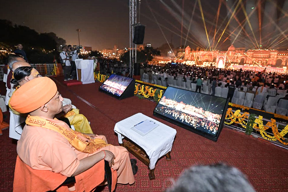 बहरहाल, शुक्रवार की शाम को मुख्यमंत्री के दीप जलाने के बाद राम की पैड़ी पर दीपक जलाने शुरू हुए। इस बार 26 लाख 17 हजार दीपक एक साथ जलाए गए। ड्रोन से इन दीपों की काउंटिंग हुई। राम की पैड़ी पर लेजर लाइट शो भी किया गया। मुख्यमंत्री योगी आदित्यनाथ ने राम कथा पार्क में हेलीकॉप्टर से उतरे श्रीराम, माता सीता और लक्ष्मण का स्वागत किया। मुख्यमंत्री ने सभी का माल्यार्पण किया। इसके बाद श्रीराम, सीता के रथ से खींच कर मंच तक ले गए। यहां सभी का तिलक लगाने के बाद आरती की। फिर राम राज्याभिषेक किया गया।