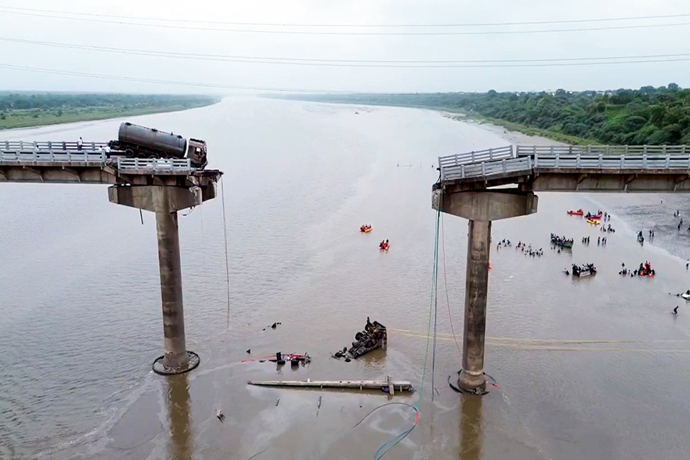 अहमदाबाद। गुजरात में एक और चलता हुआ पुल टूट गया, जिससे कई गाड़ियां नदी में गिर गईं। इस हादसे में 13 लोगों की मौत हो गई है। गाड़ियों के साथ नदी में गिरे आठ लोगों को स्थानीय लोगों ने बचाया। यह पुल महिसागर नदी पर बना है और वडोदरा को आणंद से जोड़ता है। बुधवार की सुबह अचानक यह पुल बीच से टूट गया और इसका एक हिस्सा नदी में गिर गया। उस समय कई गाड़ियां पुल के ऊपर से गुजर रही थीं। बताया गया है कि पुल 45 साल पुराना है और इसे लेकर कई सालों से चिंता जताई जा रही थी। जिला पंचायत के सदस्य हर्षद सिंह परमार ने सरकार को चिट्ठी लिख कर पुल की जर्जर हालत की जानकारी दी थी।