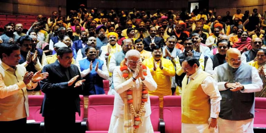 Narendra Modi :- प्रधानमंत्री नरेन्द्र मोदी ने तीन राज्यों में भारतीय जनता पार्टी (भाजपा) की प्रचंड जीत को सभी कार्यकर्ताओं की सामूहिक जीत बताते हुए सभी भाजपा सांसदों का आह्वान किया कि वे 2024 के लोकसभा चुनावों के लिए जी जान से जुट जायें और सरकार की योजनाओं खासकर विश्वकर्मा योजना का प्रचार प्रसार करें। संसद के पुस्तकालय भवन के जीएमसी बालयोगी सभागार में भाजपा संसदीय दल की बैठक में श्री मोदी का सांसदों ने अभिनंदन किया। भाजपा के अध्यक्ष जगत प्रकाश नड्डा, गृह मंत्री अमित शाह, सड़क परिवहन एवं राजमार्ग मंत्री नितिन गडकरी, संसदीय कार्य मंत्री प्रल्हाद जोशी, राज्यसभा में नेता सदन एवं केन्द्रीय मंत्री पीयूष गोयल, अश्विनी चौबे, आदि मौजूद थे।