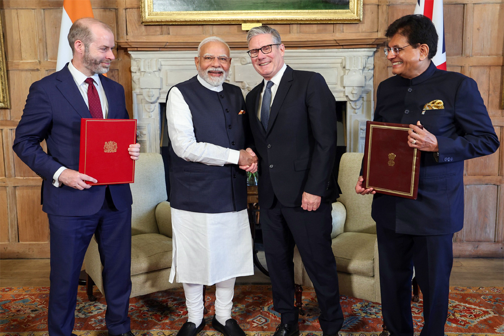 नई दिल्ली। भारत और ब्रिटेन के बीच बरसों से चल रही मुक्त व्यापार की वार्ता अंतिम नतीजे पर पहुंच गई। गुरुवार को लंदन में प्रधानमंत्री नरेंद्र मोदी और ब्रिटेन के प्रधानमंत्री कीर स्टार्मर की मौजूदगी में मुक्त व्यापार समझौते पर दस्तखत हुए। भारत की ओर से वाणिज्य मंत्री पीयूष गोयल और ब्रिटेन की ओर से व्यापार मंत्री जोनाथन रेनॉल्ड्स ने दस्तखत किए। इस समझौते के बाद भारत और ब्रिटेन के बीच व्यापार कई गुना बढ़ेगा और दोनों देशों के नागरिकों को सस्ती वस्तुएं मिलेंगी। इस ऐतिहासिक समझौते के लिए प्रधानमंत्री मोदी बुधवार को लंदन पहुंचे।
