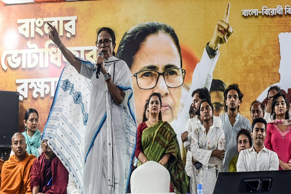 ममता बनर्जी ने कहा कि प्रधानमंत्री मोदी को 2024 में इसी वोटर लिस्ट के आधार पर वोट मिले थे। अगर लोगों का नाम हटा दिया जाता है, तो केंद्र सरकार को भी हटा देना चाहिए। उन्होंने चुनौती देते हुए कहा, इतनी जल्दी में एसआईआर क्यों चलाया जा रहा है? जब तक मैं यहां हूं, मैं उन्हें आपको बाहर नहीं निकालने दूंगी। कोई भी आपको बाहर नहीं निकाल सकता। अगर बीजेपी बंगाल में मुझे चोट पहुंचाने की कोशिश करेगी, तो मैं पूरे भारत में उसकी नींव हिला दूंगी। भाजपा मुझें राजनीतिक रूप से न तो चुनौती दे सकती है और न ही हरा सकती है’।