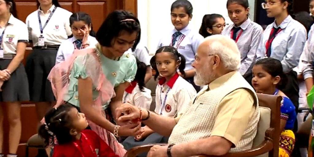 Narendra Modi :- प्रधानमंत्री नरेंद्र मोदी ने बुधवार को विभिन्न आयु वर्ग की स्कूली लड़कियों के साथ रक्षा बंधन का त्योहार मनाया। प्रधानमंत्री ने छात्राओं से बातचीत भी की। बुधवार की सुबह, मोदी ने एक्स (पूर्व में ट्विटर) पर देश को रक्षा बंधन के शुभ अवसर पर शुभकामनाएं दीं। पीएम मोदी, “मेरे परिवार के सभी सदस्यों को रक्षाबंधन की शुभकामनाएं।