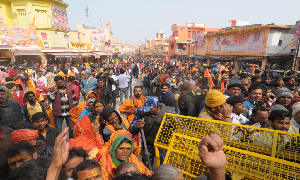 अयोध्या। श्रीराम जन्मभूमि मंदिर में रामलला की प्राण प्रतिष्ठा के अगले दिन यानी मंगलवार को श्रद्धालुओं का जबरदस्त भीड़ जुटी। मुख्यमंत्री योगी आदित्यनाथ भी खुद अयोध्या पहुंचे। भीड़ के बेकाबू होने पर मुख्यमंत्री ने खुद माइक संभाला और लाउडस्पीकर के जरिए लोगों से व्यवस्था बनाए रखने की अपील की। उन्होंने लोगों से कहा कि जरुरत होने पर दर्शन का समय बढ़ाया जाएगा। गौरतलब है कि प्राण प्रतिष्ठा के बाद मंगलवार को ही मंदिर में आम लोगों के लिए दर्शन शुरू हुआ है।