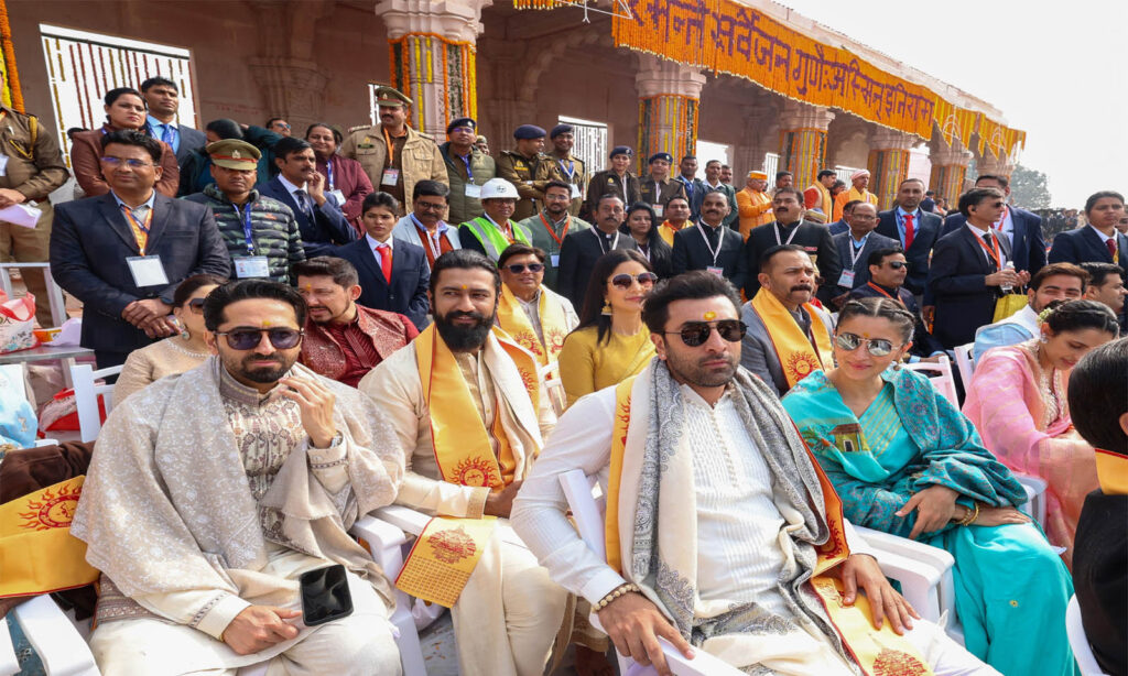 रामलला की प्रतिमा की प्राण प्रतिष्ठा के कार्यक्रम में अमिताभ बच्चन और उनके बेटे अभिषेक बच्चन के साथ तमिल फिल्मों को सुपर सितारे रजनीकांत भी शामिल हुए। तेलुगू फिल्मों के स्टार चिरंजीवी और उनके बेटा राम चरण के अलावा माधुरी दीक्षित, कंगना रनौत, रणबीर कपूर, आलिया भट्ट, विक्की कौशल, कटरीना कैफ आदि शामिल हुए। मशहूर गायक सिंगर सोनू निगम, हरिहरन और शंकर महादेवन ने भी हिस्सा लिया। सोनू निगम और शंकर महादेवन ने राम भजन भी गाए। हिंदी फिल्मों के निर्माता-निर्देशक सुभाष घई, राजकुमार हीरानी और मधुर भंडारकर भी शामिल हुए।