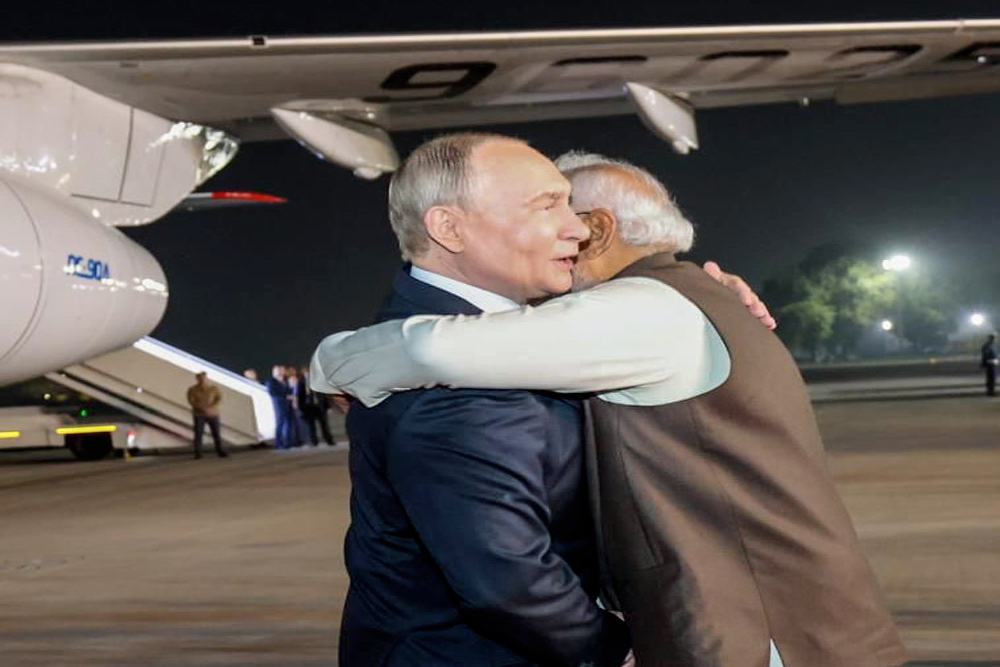 नई दिल्ली। रूस के राष्ट्रपति व्लादिमीर पुतिन गुरुवार की शाम को भारत पहुंचे। प्रधानमंत्री नरेंद्र मोदी ने खुद पालम हवाईअड्डे पर उनकी अगवानी की। शाम सात बजे पुतिन का विमान पालम हवाईअड्डे पर उतरा। विमान से निकलने के बाद उनका भव्य स्वागत हुआ और मोदी ने उनको गले लगा कर अगवानी की। हवाईअड्डे पर पुतिन को गार्ड ऑफ ऑनर दिया गया। इसके बाद दोनों नेता एक साथ लोक कल्याण मार्ग पहुंचे, जहां मोदी ने उनको स्वागत में प्राइवेट डिनर का आयोजन किया था।