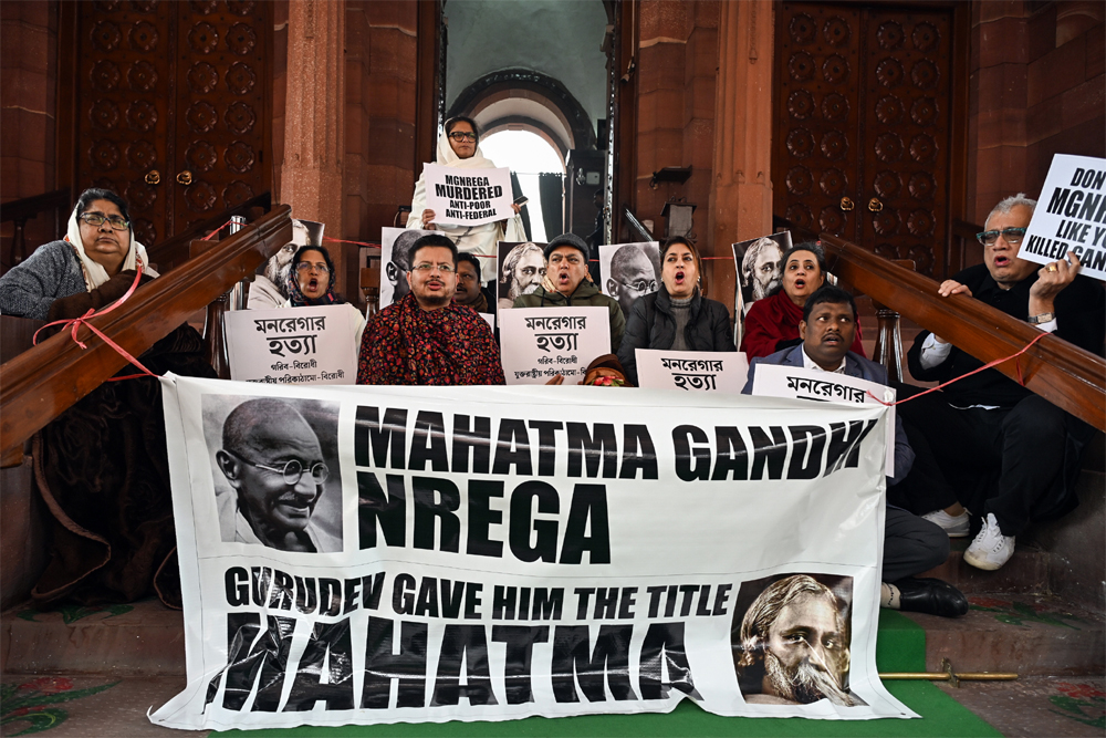 कांग्रेस पार्टी महात्मा गांधी पर अपना दावा करती है लेकिन महात्मा गांधी राष्ट्रीय रोजगार ग्रामीण योजना यानी मनरेगा को समाप्त किया गया तो कांग्रेस इसे बड़ा मुद्दा नहीं बना सकी। उसकी बजाय ममता बनर्जी की पार्टी तृणमूल कांग्रेस ने इसे मुद्दा बना दिया। दिल्ली से लेकर कोलकाता तक तृणमूल कांग्रेस ने इसे बड़ा मुद्दा बनाया। ममता बनर्जी ने कोलकाता में प्रेस कॉन्फ्रेंस करके कहा कि केंद्र सरकार ने महात्मा गांधी का अपमान किया है। उन्होंने ऐलान किया कि पश्चिम बंगाल सरकार की जो रोजगार योजना चलती है, जिसका नाम कर्म  योजना है उसका नाम अब महात्मा गांधी के नाम पर होगा। तृणमूल कांग्रेस ने टैगोर और बंकिम चंद्र से  लेकर महात्मा गांधी तक के अपमान का मुद्दा बना कर भाजपा को कठघरे में खड़ा किया।