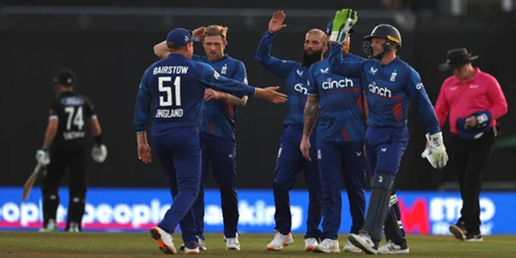 बारिश के कारण मैच 34-34 ओवरों का हो गया, जिससे टॉस जीतकर न्यूजीलैंड के कप्तान टॉम लैथम के पहले गेंदबाजी करने के फैसले के बाद इंग्लैंड सीधे ही मुसीबत में फंस गया। मेजबान टीम ने जॉनी बेयरस्टो (6), जो रूट (0) और बेन स्टोक्स (1) को अनुभवी ट्रेंट बोल्ट की गति और चालाकी के कारण खो दिया, जो ब्रेक के बाद टीम में लौटे और जल्द ही इंग्लैंड को झटका दिया। और जब फॉर्म में चल रहे युवा स्टार हैरी ब्रूक (2) को मैट हेनरी की गेंद पर एलन ने कैच किया, तो इंग्लैंड 28/4 पर बुरी स्थिति में था। कप्तान जोस बटलर ने 25 गेंदों में 30 रन बनाये लेकिन मिशेल सैंटनर ने उन्हें आउट कर स्कोर 55/5 कर दिया। और जब मोईन अली को 33 रन पर पवेलियन भेजा गया तो 21वें ओवर में मेजबान टीम का स्कोर 103/8 था।